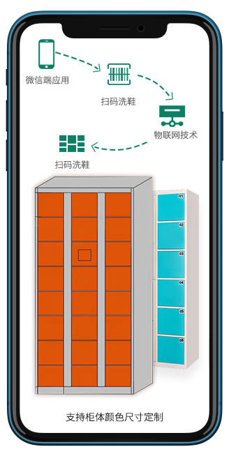 3:共享洗鞋柜系統24小時無人值守,微信掃碼付費,實現高效率服務。